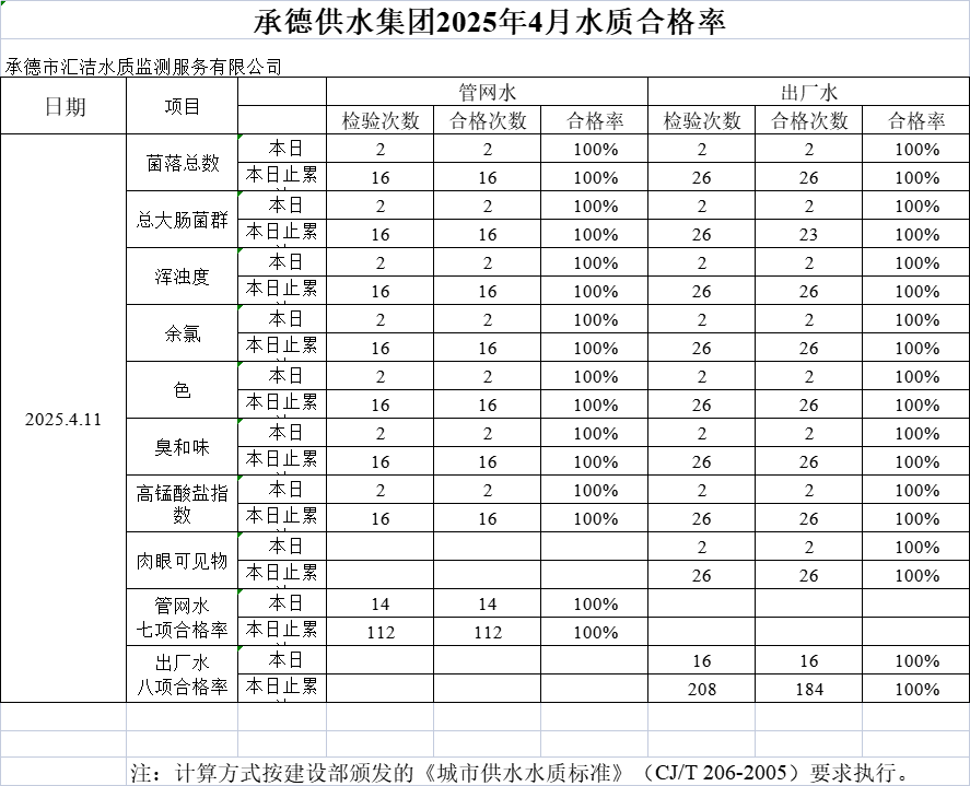 承德供水集團(tuán)2025年4月11日水質(zhì)合格率