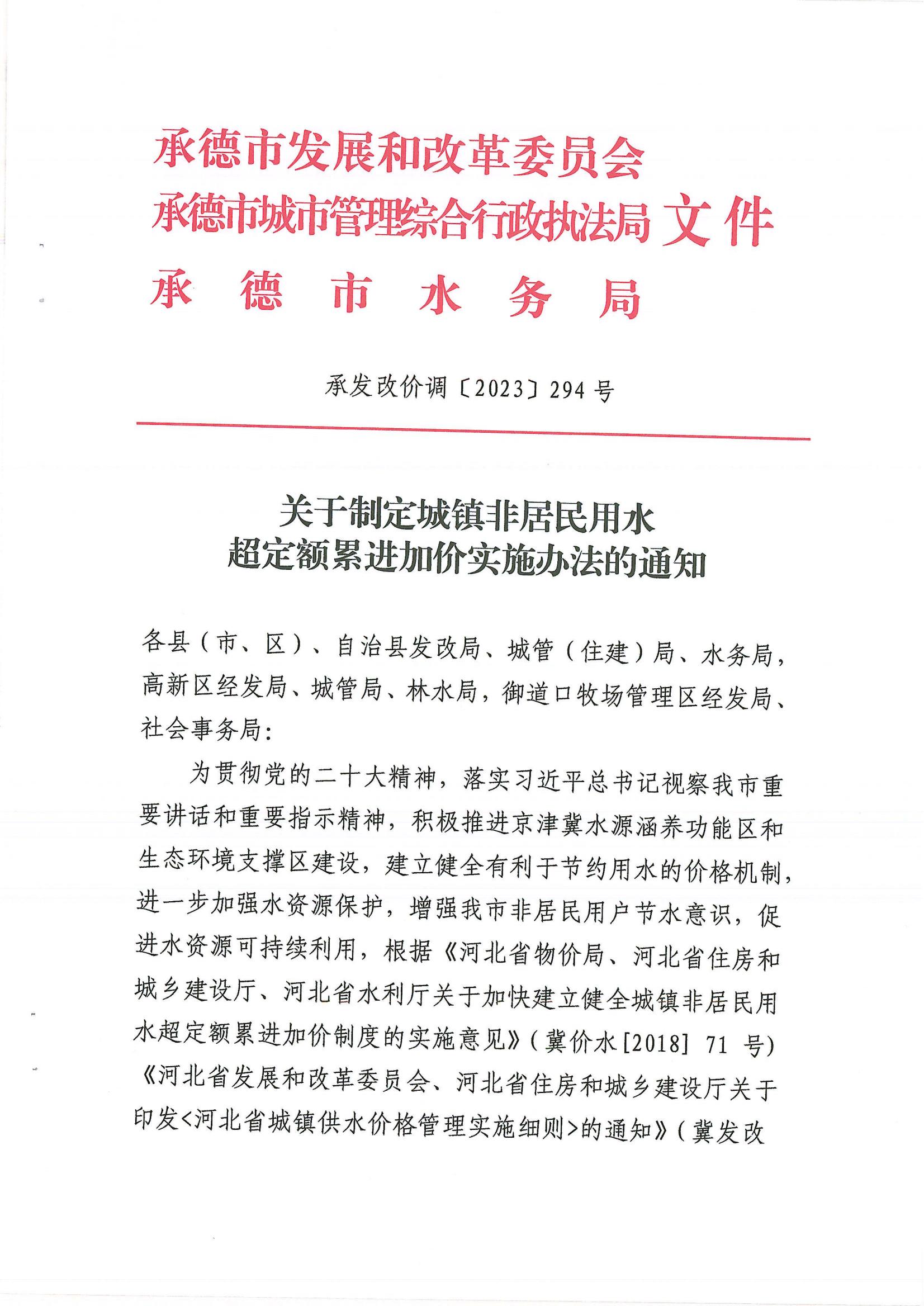承德市發(fā)展和改革委員會等三部門關(guān)于制定城鎮(zhèn)非居民用水超定額累進(jìn)加價實(shí)施辦法的通知 承發(fā)改價調(diào)〔2023〕294號